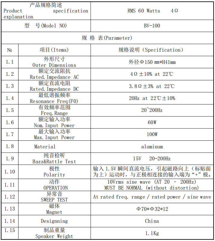 1、The specification of bass shaker(制品规格表)